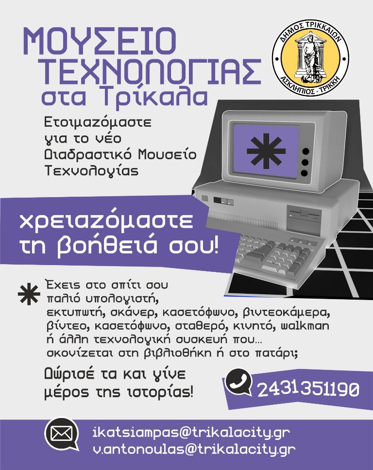 Το νέο Διαδραστικό Μουσείο Τεχνολογίας στα Τρίκαλα ετοιμάζεται και ο Δήμος Τρικκαίων απευθύνεται στους πολίτες που θέλουν να συμβάλουν στη δημιουργία του. Στον χώρο της...