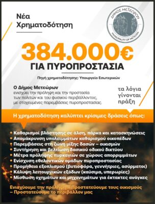 Ο Δήμος Μετεώρων εξασφάλισε χρηματοδότηση ύψους 384.000 ευρώ από το Υπουργείο Εσωτερικών για την αντιπυρική περίοδο του 2026, μετά από απόφαση του Υπουργού κ. Θεόδωρου...