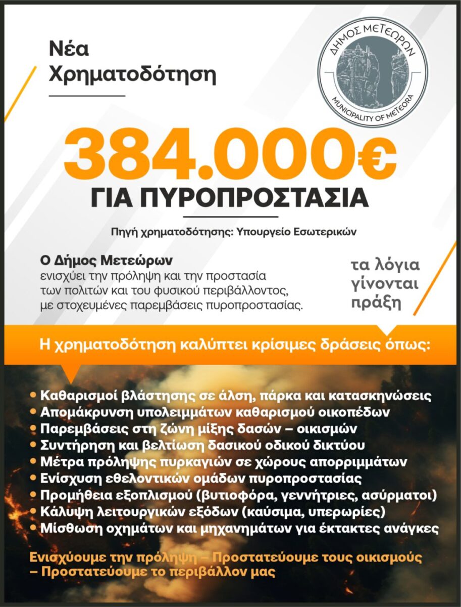 Ο Δήμος Μετεώρων εξασφαλίζει χρηματοδότηση 384.000 ευρώ για την αντιπυρική περίοδο 2026 από το Υπουργείο Εσωτερικών