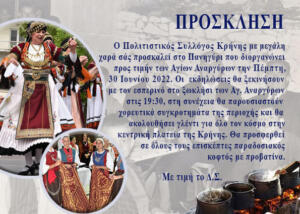 Μουσικοχορευτική βραδιά με παραδοσιακή ορχήστρα προετοιμάζει ο Πολιτιστικός Σύλλογος Κρήνης την Πέμπτη 30 Ιουνίου στην κεντρική πλατεία του χωριού Ο...