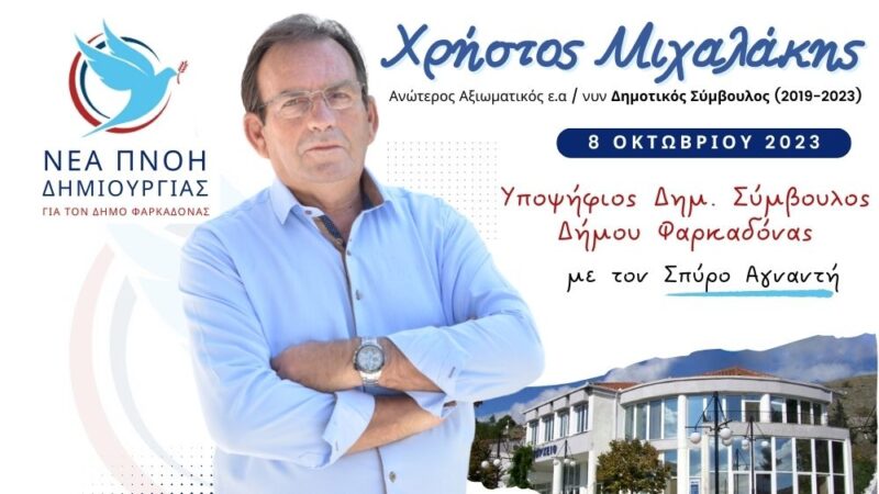 Στην ανανέωση της θητείας του, ως δημοτικός σύμβουλος Φαρκαδόνας, στοχεύει ο δημοτικός σύμβουλος Φαρκαδόνας και εκ νέου υποψήφιος με το...