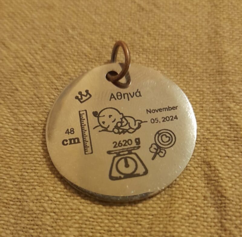 Βρέθηκε το παρακάτω μεταλλικό μενταγιόν με χαραγμένα στοιχεία γέννησης (όνομα: Αθηνά, ημερομηνία: 5 Νοεμβρίου 2024, βάρος: 2620 g, ύψος: 48...