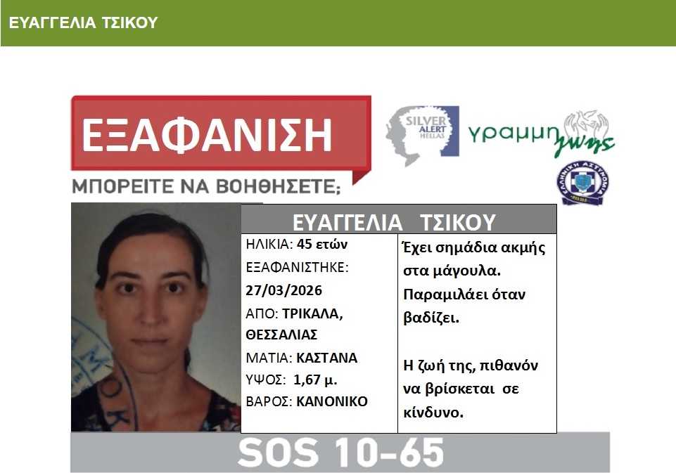 Η Ευαγγελία Τσίκου, 45 ετών, εξαφανίστηκε το μεσημέρι της 27ης Μαρτίου 2026 από την οικία της στα Τρίκαλα Θεσσαλίας. Πρόκειται...