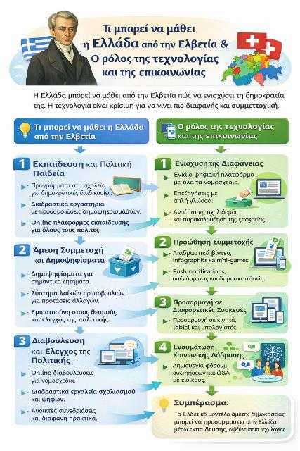 • Πολιτική παιδεία και συμμετοχή: Η ελβετική κοινωνία είναι εξοικειωμένη με την άμεση συμμετοχή, ενώ στην Ελλάδα η πολιτική παιδεία παραμένει περιορισμένη, με αποτέλεσμα οι πολίτες να μην αξιοποιούν πλήρως τα θεσμικά εργαλεία άμεσης δημοκρατίας.