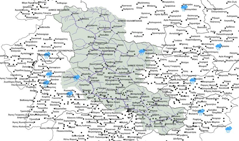 Εικόνα 1. Η απεικόνιση, της «λεκάνης απορροής» (επιφάνεια με «ανοιχτή πράσινη» απόχρωση) (του «”Αχελώου Ποταμού (Ασπροπόταμου)” που αντιστοιχεί έως την θέση στην οποία πρόκειται να κατασκευαστεί το “Φράγμα Μεσοχώρας”», η οποία βρίσκεται περίπου στην θέση ανάμεσα στον οικισμό «Συκιά» και στον οικισμό «Τρίλοφο»), του «υδρογραφικού (γραμμικού) δικτύου» (γραμμές με «έντονη μπλε» απόχρωση με διαβάθμιση του πάχους της γραμμής, όπου το πάχος της κάθε γραμμής εξαρτάται από την “τάξη” του εκάστοτε ρέματος που αντιπροσωπεύει δηλαδή όσο μεγαλύτερη είναι η “τάξη” του ρέματος τόσο παχύτερη είναι και η αντίστοιχη γραμμή που το αντιπροσωπεύει), των μετεωρολογικών σταθμών είτε εντός είτε εκτός και πλησίον της προαναφερθείσας λεκάνης απορροής (θεματικό εικονίδιο/σύμβολο «σύννεφο με βροχή» με «γαλάζια» απόχρωση), των «οικισμών του Δήμου Πύλης», των «οικισμών του Δήμου Μετεώρων», των «οικισμών του Δήμου Αργιθέας», των «οικισμών του Δήμου Βόρειων Τζουμέρκων», των «οικισμών του Δήμου Αγράφων», των «οικισμών του Δήμου Γεώργιου Καραϊσκάκη», των «οικισμών του Δήμου Λίμνης Πλαστήρα», των «οικισμών του Δήμου Μετσόβου», των «οικισμών του Δήμου Μουζακίου», των «οικισμών του Δήμου Τρικκαίων», και των «οικισμών του Δήμου Κεντρικών Τζουμέρκων» (κουκίδες με «μαύρη» απόχρωση και ονομασία, επίσης, με «μαύρη» απόχρωση), του «περιγράμματος του “Δήμου Πύλης”», του «περιγράμματος του “Δήμου Μετεώρων”», του «περιγράμματος του “Δήμου Αργιθέας”», «περιγράμματος του “Δήμου Βόρειων Τζουμέρκων”», «περιγράμματος του “Δήμου Αγράφων”», «περιγράμματος του “Δήμου Γεώργιου Καραϊσκάκη”», «περιγράμματος του “Δήμου Λίμνης Πλαστήρα”», «περιγράμματος του “Δήμου Μετσόβου”», «περιγράμματος του “Δήμου Μουζακίου”», «περιγράμματος του “Δήμου Τρικκαίων”», και του «περιγράμματος του “Δήμου Κεντρικών Τζουμέρκων”» (γραμμές με «μαύρη» απόχρωση), όπως απεικονίζονται στο «ελεύθερο διαδικτυακά λογισμικό» «Q.G.I.S.» [4], μέσω των σχετικών αρχείων που ανακτήθηκαν τόσο από την σχετική διαδικτυακή «πλατφόρμα» («Copernicus») όσο και από την σχετική διαδικτυακή «πλατφόρμα» («ΕΛ.ΣΤΑΤ.»),[1,2,4].