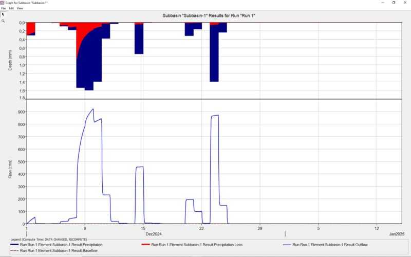 Επιπλέον, αρχικά, στην παρακάτω εικόνα απεικονίζεται το, “προσομοιωμένο ρεαλιστικό”, «διάγραμμα / ιστόγραμμα βροχόπτωσης / απορροής» του χρονικού διαστήματος, “01-31/12/2024” (“401,50 mm”), (το οποίο και «απέδωσε» την, “προσομοιωμένη ρεαλιστική”, ενδεικτική παροχή αιχμής νερού, ομαλής παροχέτευσης και συγκεκριμένα «923,10 κυβικά μέτρα ανά δευτερόλεπτο» ή αλλιώς «923,10 m3/sec»), [το οποίο και «απέδωσε», λόγω των συγκεκριμένων προαναφερθείσών βροχοπτώσεων, την, “προσομοιωμένη ρεαλιστική”, συνολική ποσότητα νερού, συγκεκριμένα, «387.703.700 κυβικά μέτρα (τόνους νερού)» ή αλλιώς «387.703.700 m3 (τόνους νερού)»], και το αντίστοιχο, “προσομοιωμένο ρεαλιστικό”, «υδρογράφημα πλημμύρας» που προκύπτει από τα συγκεκριμένα, “προσομοιωμένα ρεαλιστικά”, επεισόδια βροχοπτώσεων, (η ανάλυση και οι υπολογισμοί έγιναν με το ελεύθερο στο διαδίκτυο λογισμικό «HEC–HMS» του «U.S.A. Army Corps of Engineers» δηλαδή του «Σώματος Μηχανικών του Στρατού των Η.Π.Α.») [1,2,4,5,6.1-6.4,7].