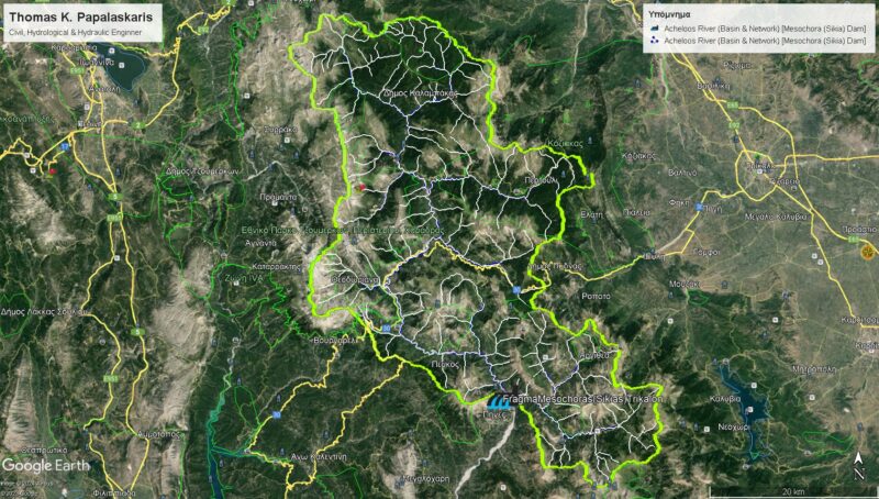 Εικόνα 3. Η απεικόνιση της λεκάνης απορροής, [περίγραμμα επιφάνειας με «ανοιχτή πράσινη» απόχρωση, που αντιστοιχεί έως την θέση όπου πρόκειται να κατασκευαστεί το «Φράγμα Μεσοχώρας», [του «“Δήμου Πύλης”, “Νομού (“Π.Ε.”) Τρικάλων”»), «“Δήμου Μετεώρων”, “Νομού (“Π.Ε.”) Τρικάλων”», «“Δήμου Αργιθέας”, “Νομού (“Π.Ε.”) Καρδίτσας”» και «“Δήμου Κεντρικών Τζουμέρκων”, “Νομού (“Π.Ε.”) Άρτας”»], Νομού Τρικάλων”»] και του (ελαφρά συνεπτυγμένου) αντίστοιχου, περιεχόμενου σε αυτήν, υδρογραφικού δικτύου (γραμμές με «ανοιχτή άσπρη» απόχρωση), του «Ποταμού Αχελώου (Ασπροπόταμου)» επί του υπόβαθρου της διαδικτυακής πλατφόρμας «Google Earth» [1,2,4,10].