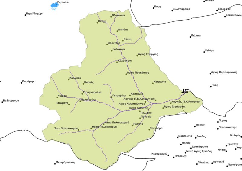 Εικόνα 1. Η απεικόνιση, της «λεκάνης απορροής» (επιφάνεια με «ανοιχτή πράσινη» απόχρωση) (του «”Πορταϊκού Ποταμού” πουαντιστοιχεί έως την θέση στην οποία πρόκειται να κατασκευαστεί το “Φράγμα Πύλης”», η οποία βρίσκεται περίπου στην θέση ανάμεσα στον οικισμό «Κοτρώνιο» και στον οικισμό «Πύλη»), του «υδρογραφικού (γραμμικού) δικτύου» (γραμμές με «έντονη μπλε» απόχρωση με διαβάθμιση του πάχους της γραμμής, όπου το πάχος της κάθε γραμμής εξαρτάται από την “τάξη” του εκάστοτε ρέματος που αντιπροσωπεύει δηλαδή όσο μεγαλύτερη είναι η “τάξη” του ρέματος τόσο παχύτερη είναι και η αντίστοιχη γραμμή που το αντιπροσωπεύει), των «οικισμών του Δήμου Πύλης», των «οικισμών του Δήμου Μουζακίου», των «οικισμών του Δήμου Αργιθέας» και των «οικισμών του Δήμου Τρικκαίων» (κουκίδες με «μαύρη» απόχρωση και ονομασία, επίσης, με «μαύρη» απόχρωση), του «περιγράμματος του “Δήμου Πύλης”», του «περιγράμματος του “Δήμου Μουζακίου”», του «περιγράμματος του “Δήμου Αργιθέας”»και του «περιγράμματος του “Δήμου Τρικκαίων”» (γραμμές με «μαύρη απόχρωση»), όπως απεικονίζονται στο «ελεύθερο διαδικτυακά λογισμικό» «Q.G.I.S.» [4], μέσω των σχετικών αρχείων που ανακτήθηκαν τόσο από την σχετική διαδικτυακή «πλατφόρμα» («Copernicus») όσο και από την σχετική διαδικτυακή «πλατφόρμα» («ΕΛ.ΣΤΑΤ.»),[1,2,4].