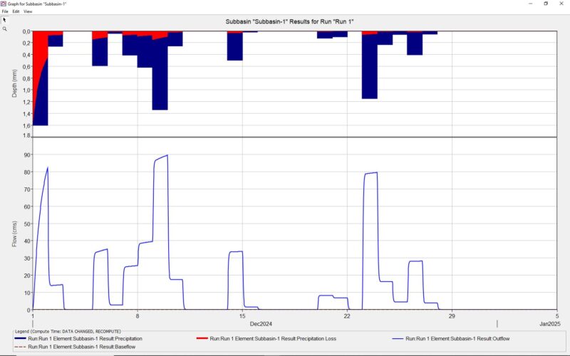 Επιπλέον, αρχικά, στην παρακάτω εικόνα απεικονίζεται το, “προσομοιωμένο ρεαλιστικό”, «διάγραμμα/ιστόγραμμα βροχόπτωσης/απορροής» του χρονικού διαστήματος, “01-31/12/2024” (“373,00 mm”), (το οποίο και «απέδωσε» την, “προσομοιωμένη ρεαλιστική”, ενδεικτική, παροχή αιχμής, ομαλής παροχέτευσης, νερού και συγκεκριμένα «89,60 κυβικά μέτρα ανά δευτερόλεπτο» ή αλλιώς «89,60 m3/sec»), [το οποίο και «απέδωσε», λόγω των τελευταίων, σχετικά πρόσφατων, βροχοπτώσεων, την, “προσομοιωμένη ρεαλιστική”, συνολική ποσότητα νερού, συγκεκριμένα, «39.504.300 κυβικά μέτρα (τόνους νερού)» ή αλλιώς «39.504.300 m3 (τόνους νερού)»], και το αντίστοιχο, “προσομοιωμένο ρεαλιστικό”, «υδρογράφημα πλημμύρας» που προκύπτει από τα συγκεκριμένα, “προσομοιωμένα ρεαλιστικά”, επεισόδια βροχοπτώσεων, (λόγω των συγκεκριμένων, σχετικά πρόσφατων, βροχοπτώσεων), (η ανάλυση και οι υπολογισμοί έγιναν με το ελεύθερο στο διαδίκτυο λογισμικό «HEC-HMS» του «U.S.A. Army Corps of Engineers» δηλαδή του «Σώματος Μηχανικών του Στρατού των Η.Π.Α.») [1,2,4,5,6.1-6.4,7].
