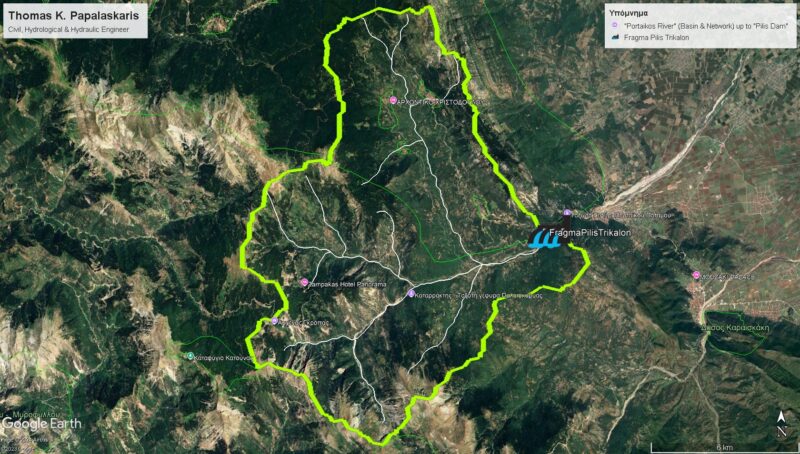 Εικόνα 3. Η απεικόνιση της λεκάνης απορροής, [περίγραμμα επιφάνειας με «ανοιχτή πράσινη» απόχρωση, πουαντιστοιχεί έως την θέση όπου πρόκειται να κατασκευαστεί το «Φράγμα Πύλης», (“Δήμου Πύλης”), Νομού Τρικάλων”»] και του (ελαφρά συνεπτυγμένου) αντίστοιχου, περιεχόμενου σε αυτήν, υδρογραφικού δικτύου (γραμμές με «λευκή» απόχρωση), του «Ποταμού Πορταϊκού» επί του υπόβαθρου της διαδικτυακής πλατφόρμας «Google Earth» [1,2,4,10].