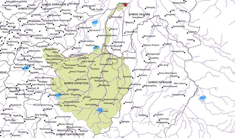 Εικόνα 1.   Η απεικόνιση, της «λεκάνης απορροής» (επιφάνεια με «ανοιχτή πράσινη» απόχρωση) (του «”Ποταμού Καλέντζη” πουαντιστοιχεί έως την θέση της τομής του αναχώματος (σημείο στο βορειοανατολικό άκρο της προαναφερθείσας λεκάνης απορροής με «κόκκινη» απόχρωση), στο ύψος του οικισμού “Κοσκινάς (“Δήμου Παλαμά”) Καρδίτσας”», το οποίο βρίσκεται κοντά στον οικισμό «Ψαθοχώρι»), του «υδρογραφικού (γραμμικού) δικτύου» (γραμμές με «έντονη μπλε» απόχρωση με διαβάθμιση του πάχους της γραμμής, όπου το πάχος της κάθε γραμμής εξαρτάται από την “τάξη” του εκάστοτε ρέματος που αντιπροσωπεύει δηλαδή όσο μεγαλύτερη είναι η “τάξη” του ρέματος τόσο παχύτερη είναι και η αντίστοιχη γραμμή που το αντιπροσωπεύει), των «οικισμών του “Δήμου Παλαμά”», των «οικισμών του “Δήμου Καρδίτσας”», των «οικισμών του “Δήμου Μουζακίου”», των «οικισμών του “Δήμου Φαρκαδόνας”», των «οικισμών του “Δήμου Πύλης”», των «οικισμών του “Δήμου Τρικκαίων”», των «οικισμών του “Δήμου Λίμνης Πλαστήρα”», των «οικισμών του “Δήμου Σοφάδων”», των «οικισμών του “Δήμου Αγράφων”», των «οικισμών του “Δήμου Καρπενησίου”», των «οικισμών του “Δήμου Αργιθέας”», (κουκίδες με «μαύρη» απόχρωση και ονομασία, επίσης, με «μαύρη» απόχρωση), του «περιγράμματος του “Δήμου Παλαμά”», του «περιγράμματος του “Δήμου Καρδίτσας”», του «περιγράμματος του “Δήμου Μουζακίου”», του «περιγράμματος του “Δήμου Φαρκαδόνας”», του «περιγράμματος του “Δήμου Πύλης”», του «περιγράμματος του “Δήμου Τρικκαίων”», του «περιγράμματος του “Δήμου Πλαστήρα”», του «περιγράμματος του “Δήμου Σοφάδων”», του «περιγράμματος του “Δήμου Αγράφων”», του «περιγράμματος του “Δήμου Καρπενησίου”» και του «περιγράμματος του “Δήμου Αργιθέας”» και οι διάφοροι μετεωρολογικοί σταθμοί στην ευρύτερη περιοχή της προαναφερθείσας λεκάνης απορροής (θεματικά εικονίδια «σύννεφα με βροχή» με «θαλασσί απόχρωση»), (διακεκομμένες γραμμές με «μαύρη απόχρωση»), όπως απεικονίζονται στο «ελεύθερο διαδικτυακά λογισμικό» «Q.G.I.S.» [4], μέσω των σχετικών αρχείων που ανακτήθηκαν τόσο από την σχετική διαδικτυακή «πλατφόρμα» («Copernicus») όσο και από την σχετική διαδικτυακή «πλατφόρμα» («ΕΛ.ΣΤΑΤ.»),[1,2,4].