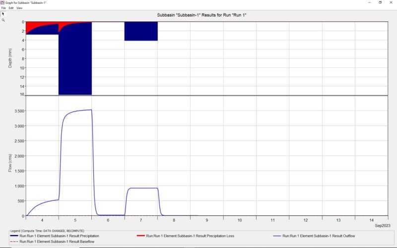 Επιπλέον, αρχικά, στην παρακάτω εικόνα απεικονίζεται το, “προσομοιωμένο ρεαλιστικό”, «διάγραμμα / ιστόγραμμα βροχόπτωσης / απορροής» του χρονικού διαστήματος, “04/09-08/09/2023” (“1.096,20 mm”), (το οποίο και θα «αποδώσει» την, “προσομοιωμένη ρεαλιστική”, παροχή αιχμής νερού και συγκεκριμένα «3.529,70 κυβικά μέτρα ανά δευτερόλεπτο» ή αλλιώς «3.529,70 m3/sec»), [το οποίο και θα «αποδώσει», λόγω ενός ακραίου μετεωρολογικού φαινομένου, παρόμοιου με αυτό με την κωδική ονομασία «Daniel», την, “προσομοιωμένη ρεαλιστική”, συνολική ποσότητα νερού, συγκεκριμένα, «411.936.200 κυβικά μέτρα (τόνους νερού)» ή αλλιώς «411.936.200 m3 (τόνους νερού)»], και το αντίστοιχο, “προσομοιωμένο ρεαλιστικό”, «υδρογράφημα απορροής πλημμύρας» που προκύπτει από το συγκεκριμένο, “προσομοιωμένο ρεαλιστικό”, επεισόδιο βροχόπτωσης, (λόγω ενός ακραίου μετεωρολογικού φαινομένου, παρόμοιου με αυτό με την αντιστοιχισμένη κωδική ονομασία «Daniel»), (η ανάλυση και οι υπολογισμοί έγιναν με το ελεύθερο στο διαδίκτυο λογισμικό «HEC-HMS» του «U.S.A. Army Corps of Engineers» δηλαδή του «Σώματος Μηχανικών του Στρατού των Η.Π.Α.») [1,2,4,5,6.1-6.3].