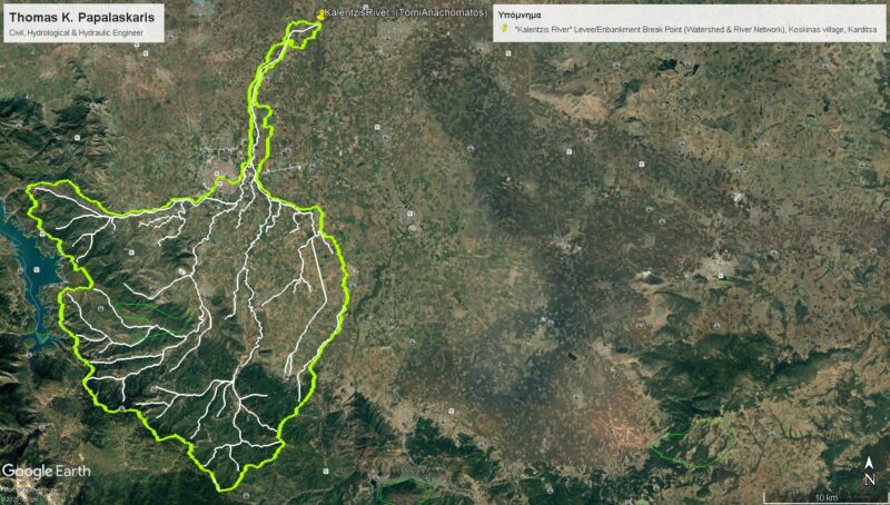 Παρατήρηση: Το παρόν δημοσίευμα θα αναμορφωθεί όταν, έπειτα από προσωπική έρευνα στο διαδίκτυο, επεξεργαστούν από τον συγγραφέα του παρόντος και τα υπόλοιπα διαθέσιμα στοιχεία των: 1).“βροχοπτώσεων της ευρύτερης περιοχής”, 2).“αναλυτικών χρήσεων γης της ευρύτερης περιοχής” (έτσι ώστε να καθοριστεί ο ακριβής “curve number”), 3).“γεωλογικά στοιχεία της ευρύτερης περιοχής“ (έτσι ώστε να καθοριστεί ο ακριβής “curve number”), που αφορούν την περιοχή της “λεκάνης απορροής”, (που αντιστοιχεί έως το φερόμενο σημείο «σπασίματος» του αναχώματος στο ύψος, περίπου, του οικισμού «Κοσκινάς» του «Δήμου Παλαμά», του «Νομού Καρδίτσας»), του «Ποταμού Καλέντζη», ενώ, επιπρόσθετα η παρούσα, (αποκλειστικά ιδιωτική και υποκειμενική), μελέτη εκπονήθηκε δωρεάν (και δόθηκε ανοιχτά στην δημοσιότητα) και δεν έχει επιδοτηθεί, (ούτε με ένα ευρώ), από κανένα είτε Εθνικό είτε Ευρωπαϊκό οικονομικό πόρο ή άλλη Υπηρεσία είτε Οργανισμό. Τέλος, τα πραγματικά δεδομένα βροχοπτώσεων, αφορούν, αποκλειστικά, τον μετεωρολογικό σταθμό της «“Ζαγοράς”, του “Δήμου Ζαγοράς-Μουρεσίου”, της/του «Π.Ε. (Νομού) Μαγνησίας», (αθροιστική βροχόπτωση ίση με «1.096,20 mm»), όπως αυτά ανακοινώθηκαν από την ιστοσελίδα “meteo.gr” και αφορούσαν το χρονικό διάστημα «04-08/09/2023» [6.1-6.3].