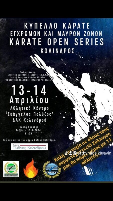 Το Σαββατοκύριακο 12 και 13 Απριλίου διεξήχθησαν οι αγώνες Open Series Kolindros υπό την αιγίδα της Ελληνικής Ομοσπονδίας Καράτε και του τοπικού Συλλόγου Πύδνας Κολινδρού. Στους αγώνες συμμετείχε μεγάλος αριθμός αθλητών (1285 αθλητές) από διάφορα μέρη της Ελλάδας.