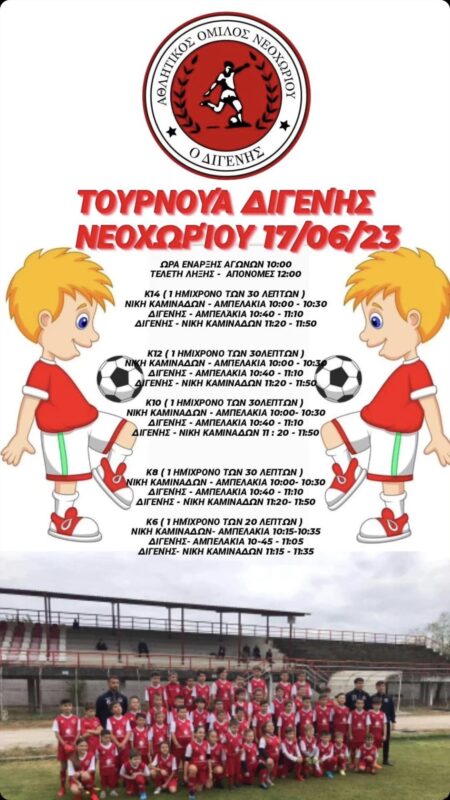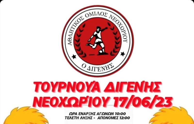 Για το ερχόμενο Σάββατο έχει προγραμματιστεί η διεξαγωγή του Τουρνουά των τμημάτων του Διγενή Νεοχωρίου. Οι αγώνες θα διεξαχθούν στο γήπεδο του Διγενή στην Οιχαλία στις 17 Ιουνίου στις 10 το πρωί.