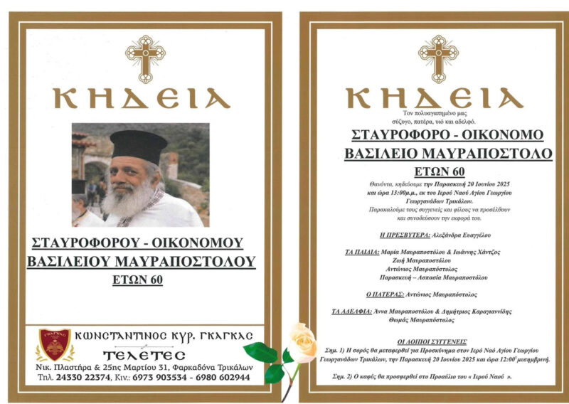 Τον πολυαγαπημένο μας σύζυγο, πατέρα, υιό και αδελφό ΣΤΑΥΡΟΦΟΡΟ – ΟΙΚΟΝΟΜΟ ΒΑΣΙΛΕΙΟ ΜΑΥΡΑΠΟΣΤΟΛΟ ετών 60, αποχαιρετούμε με βαθιά οδύνη την Παρασκευή 20 Ιουνίου 2025, στον Ιερό Ναό Αγίου Γεωργίου Γεωργανάδων Τρικάλων, όπου και θα τελεστεί η εξόδιος ακολουθία στις 13:00 το μεσημέρι.