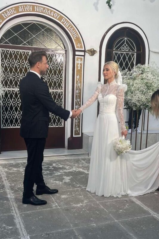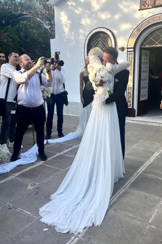 Λίγα βήματα πιο πέρα την περίμενε συγκινημένος ο γαμπρός Κώστας Καραφώτης που την υποδέχτηκε με μια μεγάλη αγκαλιά σε μια πολύ τρυφερή στιγμή πριν περάσουν στο εσωτερικό της εκκλησίας για τον γάμο τους.
