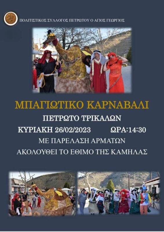 Άφθονες δόσεις χαράς και κεφιού θα προσφέρει ο Πολιτιστικός Σύλλογος Πετρωτού «Άγιος Γεώργιος» την ερχόμενη Κυριακή της Τυρινής, με την διοργάνωση του Αποκριάτικου Καρναβαλιού. Συγκεκριμένα στις 14:30 το μεσημέρι της ερχόμενης Κυριακής 26 Φεβρουαρίου, ο Πολιτιστικός Σύλλογος διοργανώνει το ετήσιο καρναβάλι με την παρέλαση των αρμάτων και την αναβίωση του εθίμου της καμήλας.