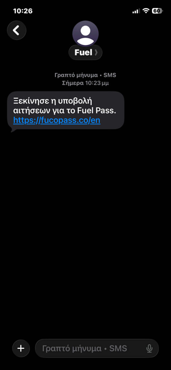 Τις τελευταίες ώρες κυκλοφορούν παραπλανητικά SMS που ενημερώνουν δήθεν για έναρξη αιτήσεων για το Fuel Pass και παραπέμπουν σε ύποπτες ιστοσελίδες.