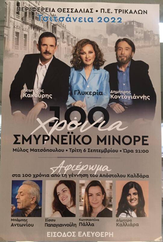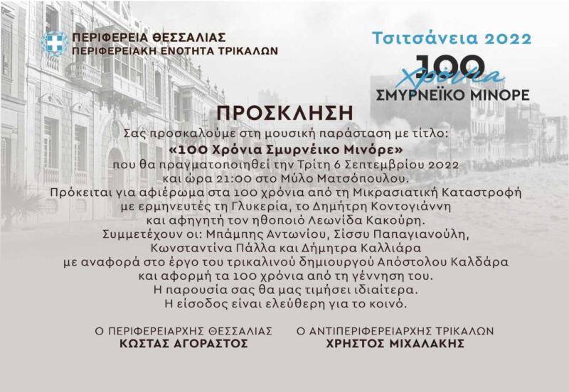 Στα 100 χρόνια του Σμυρνέϊκου τραγουδιού είναι αφιερωμένη η φετινή εκδήλωση Τσιτσάνεια 2022 που διοργανώνεται αύριο Τρίτη από την Περιφέρεια Θεσσαλίας και την Περιφερειακή Ενότητα Τρικάλων.