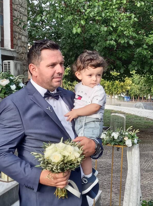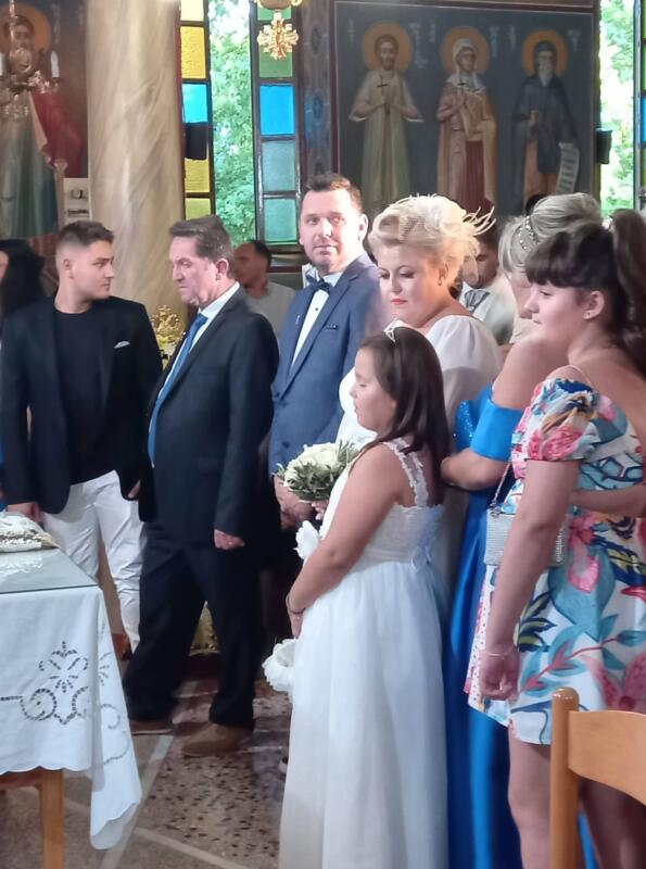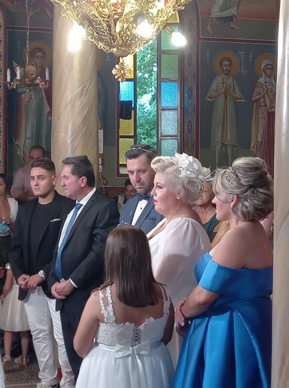 Τα Μυστήρια του Γάμου και της Βαπτίσεως τελέστηκαν στον Ιερό Ναό Κοιμήσεως της Θεοτόκου Πηνειάδας, παρουσία συγγενών και φίλων του ζευγαριού.