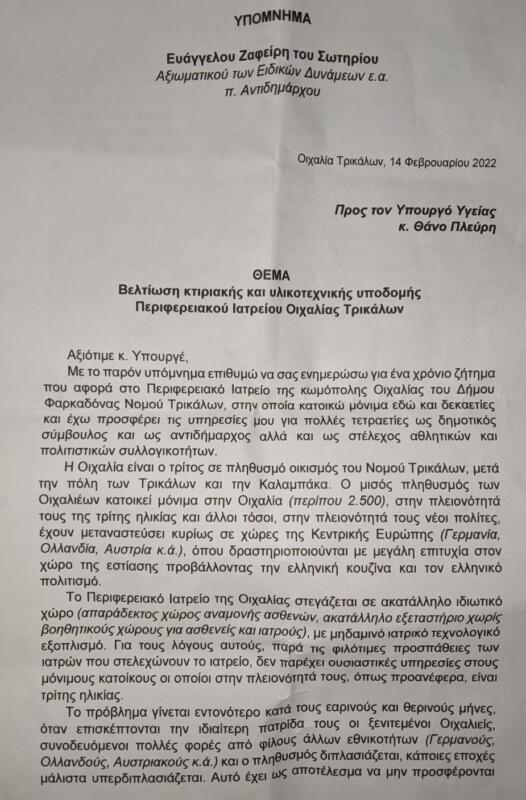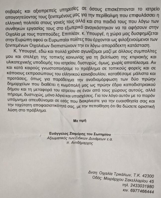 Σύμφωνα με την «KriniLive.gr» με το υπόμνημα ο κ. Ζαφείρης, προσπαθεί να ενημερώσει τους αρμόδιους φορείς για την επικρατούσα κατάσταση στο Περιφερειακό Ιατρείο Οιχαλίας, περιοχή στην οποία κατοικεί κι έχει προσφέρει τις υπηρεσίες τους για πολλές τετραετίες ως δημοτικός σύμβουλος.