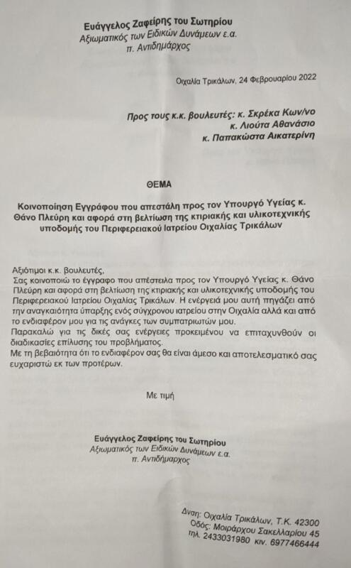 Ο πρώην δημοτικός σύμβουλος κοινοποίησε υπόμνημα στον υπουργό Υγείας και στους τοπικούς βουλευτές ζητώντας την κτηριακή και υλικοτεχνική υποδομή του Περιφερειακού Ιατρείου Οιχαλίας