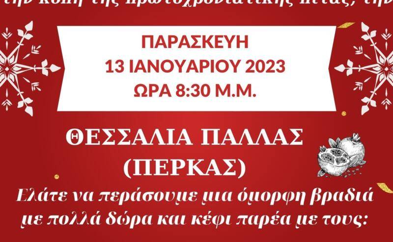 Στην εκδήλωση αναμένεται να κοπεί και η Πρωτοχρονιάτικη Πίτα του Συλλόγου. Το πρόγραμμα θα περιλαμβάνει ζωντανή μουσική από τους Αποστόλη Σακκά και Δήμητρα Καλλιάρα ενώ θα προσφερθούν πλούσια δώρα μέσω λαχειοφόρου.