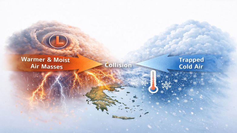 Από την Τρίτη το μεσημέρι και έπειτα, αλλάζει η “ποιότητα” του καιρού, γιατί θα μας επηρεάσει ένα βαρομετρικό χαμηλό που θα αλληλεπιδράσει με τον εγκλωβισμένο ψυχρό αέρα και άρα θα υπάρξει αυξημένη πιθανότητα για ισχυρές βροχές – καταιγίδες (κεντρικά – νότια, συμπεριλαμβάνεται και η Αττική) και πολύ πυκνά χιόνια στα ορεινά, με τις χιονοπτώσεις να εκδηλώνονται και σε ημιορεινά τμήματα της Κεντρικής Ελλάδας, αλλά και σε σχεδόν πεδινές περιοχές της Βόρειας χώρας».