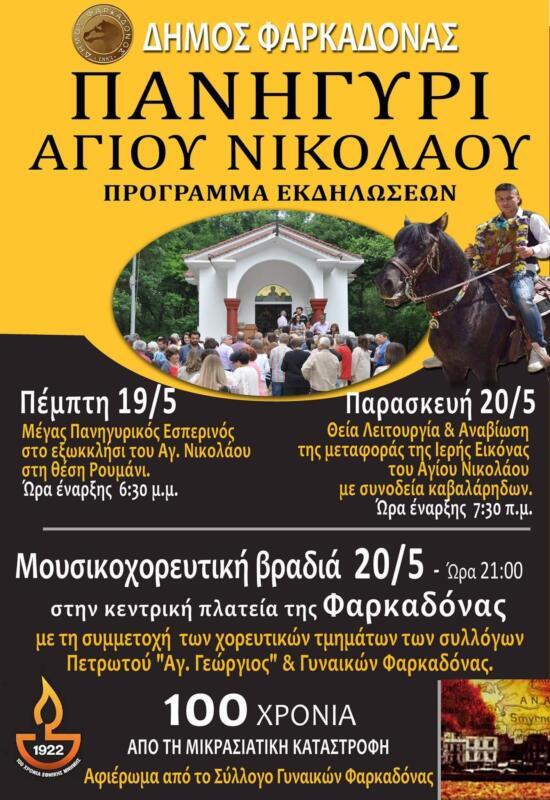 – Παρασκευή 20 Μαΐου από 7.30 έως 10.15 Θεία Λειτουργία στο εξωκλήσι του Αγίου Νικολάου και στη συνέχεια μεταφορά της Ιερής Εικόνας του Αγίου Νικολάου, συνοδεία καβαλάρηδων, από το εξωκλήσι στην εκκλησία του Αγίου Νικολάου στο κέντρο της Φαρκαδόνας.