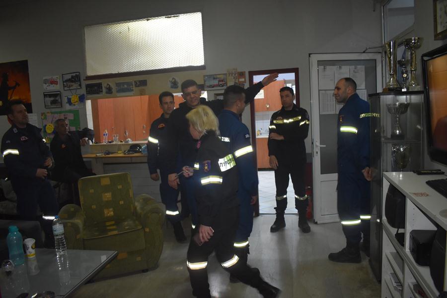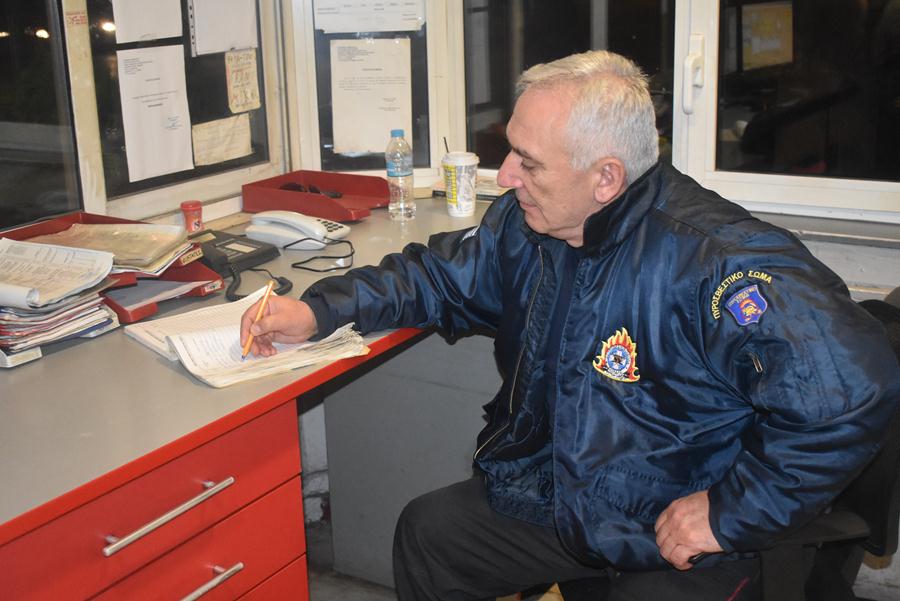 Ο Βασίλης Ρούντος, Πυρονόμος, μας περιγράφει το 24ωρο της βάρδιας: «Με το που αναλαμβάνουμε υπηρεσία στις 7.30 το πρωί, ελέγχουμε τα οχήματά μας, τα εργαλεία αν είναι στην θέση τους. Τα οχήματα, αν είναι ΟΚ από καύσιμα, νερό στα βυτία, λάδια κλπ. Ελέγχουμε τις αναπνευστικές συσκευές, αν είναι όλες έτοιμες. Έπειτα συγκεντρωνόμαστε στην λέσχη των πυροσβεστών και θα αναθέσουμε στον καθένα τις εργασίες του. Οι οδηγοί στα οχήματά τους και οι μάχιμοι στα εργαλεία τους. Στην συνέχεια ξεκινάμε την εκπαίδευση, κάτι που γίνεται κάθε μέρα, είτε είναι θεωρητική (μέσω υπολογιστή ή DVD) είτε πρακτική μέσα στα οχήματα.