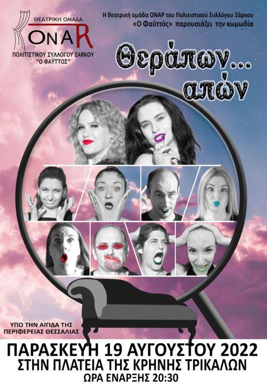 Η Θεατρική Ομάδα του Πολιτιστικού Συλλόγου Ζάρκου “Όναρ” έρχεται να σταθμεύσει στην Κρήνη ύστερα από πρόσκληση του Πολιτιστικού Συλλόγου Κρήνης, ξεδιπλώνοντας κι εκεί το ταλέντο της με την θεατρική παράσταση “Θεράπων Απών”.