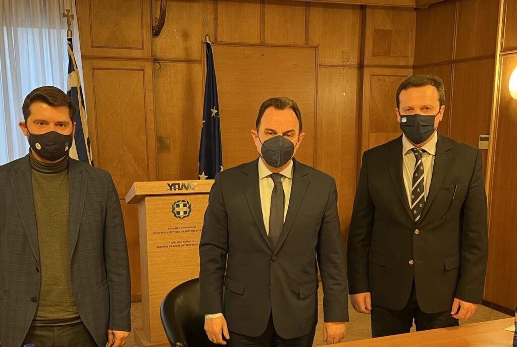 Το απόγευμα της 5ης Απριλίου 2022, ο Βουλευτής Τρικάλων μαζί με κτηνοτρόφους του Νομού μας, πραγματοποίησαν μια διευρυμένη συνάντηση εργασίας με τον Υπουργό Αγροτικής Ανάπτυξης και Τροφίμων, κ. Γεώργιο Γεωργαντά. Στη συνάντηση παρευρέθηκε και ο Γενικός Γραμματέας, Κώστας Μπαγινέτας. Στο τραπέζι των συζητήσεων τέθηκαν όλα τα ζητήματα, τα οποία αφορούν τον κτηνοτροφικό, αλλά και τον γεωργικό τομέα του τόπου μας.