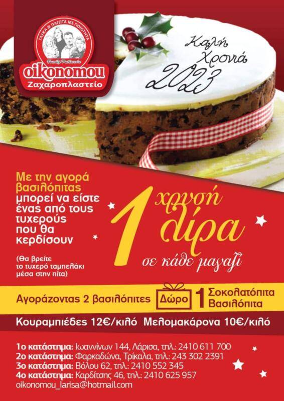 Συγκεκριμένα κι αυτή τη χρονιά τα Ζαχαροπλαστεία Οικονόμου προσφέρουν μια Χρυσή Λίρα σε τέσσερεις τυχερούς που θα προμηθευτούν την Πρωτοχρονιάτικη Βασιλόπιτα. Το ειδικό ταμπελάκι θα βρίσκεται σε μια από τις βασιλόπιτες των τεσσάρων καταστημάτων σε Λάρισα και Φαρκαδόνα.