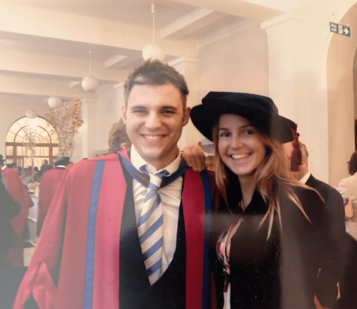 Με την αδερφή του Αλεξάνδρα στην απονομή του διδακτορικού του.