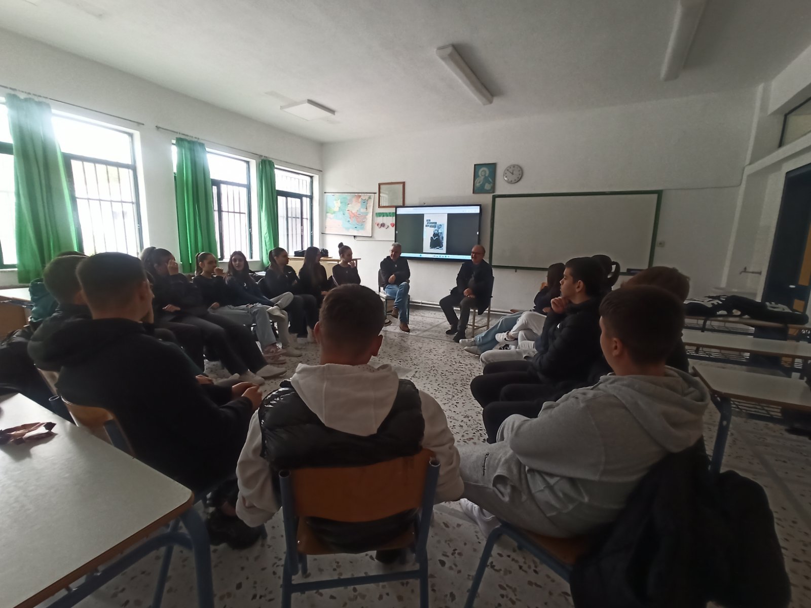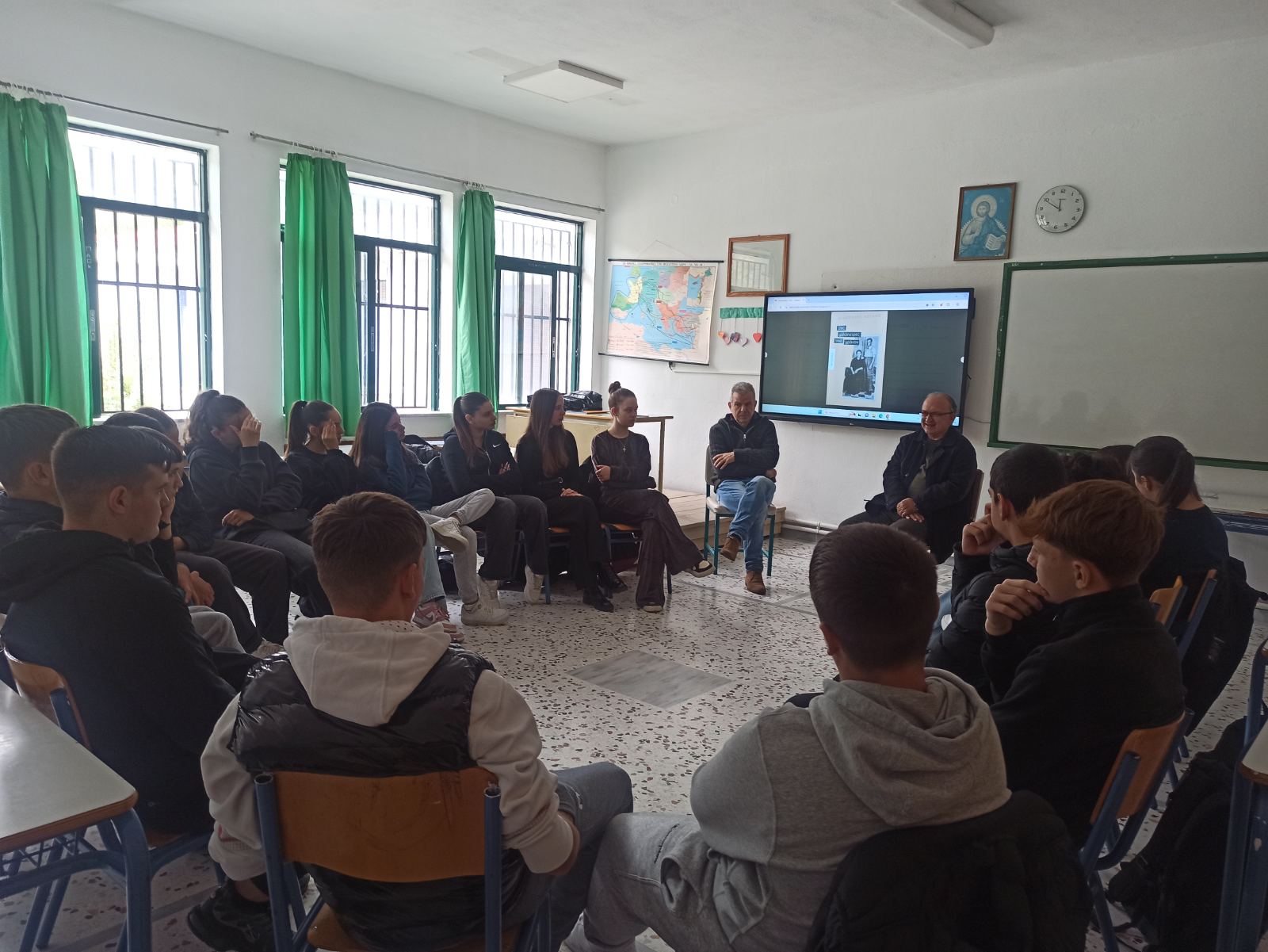 Κατά τη διάρκεια της επίσκεψής του, ο κ. Αζέλης συνομίλησε με τους μαθητές της Α΄ Λυκείου, με αφορμή το μυθιστόρημά του «Στις μυλόπετρες του χρόνου», το οποίο πρόκειται να αποτελέσει αντικείμενο μελέτης και δημιουργικής επεξεργασίας στο πλαίσιο της δράσης.