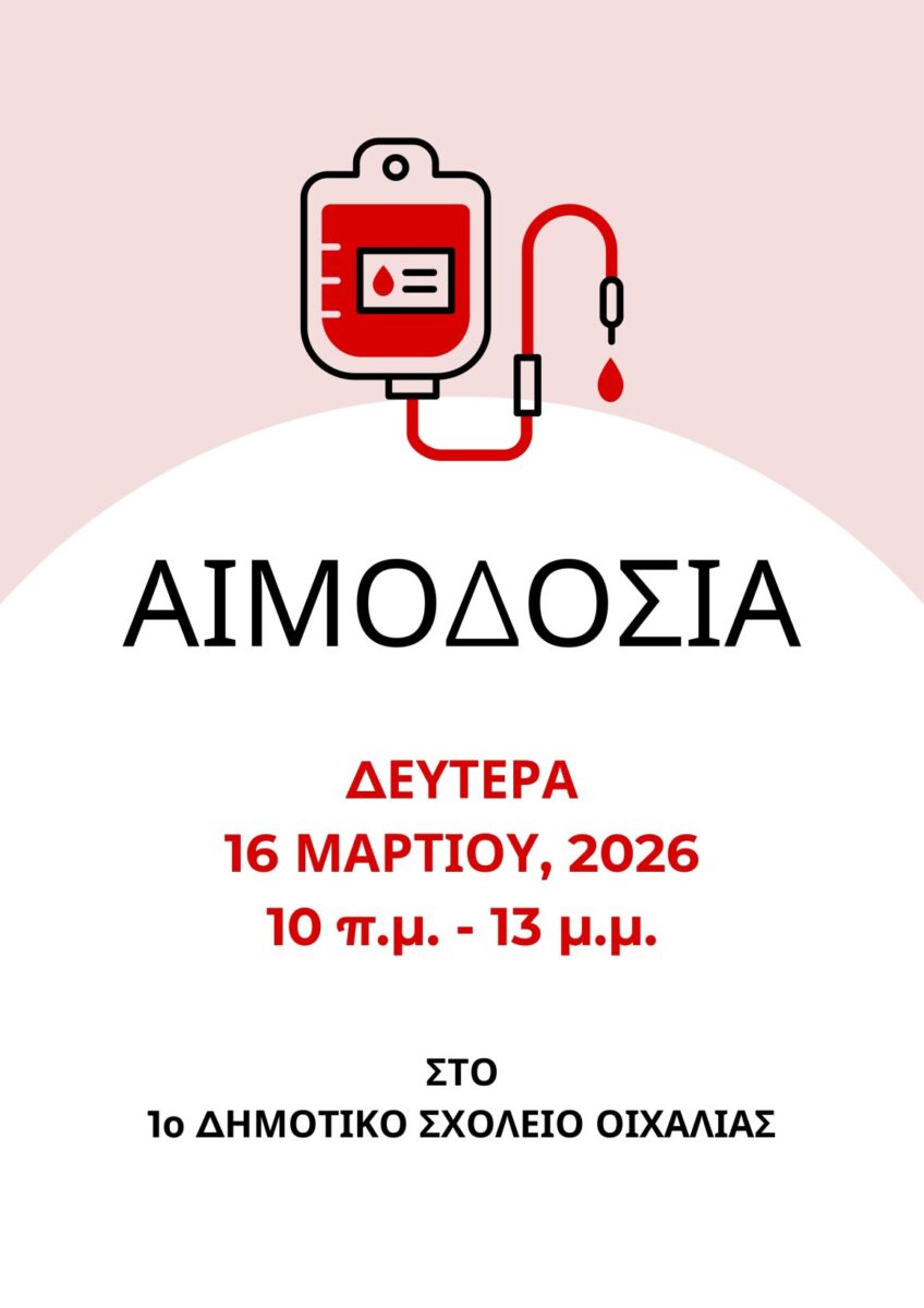 Το 1ο Δημοτικό Σχολείο Οιχαλίας διοργανώνει Ημέρα Εθελοντικής Αιμοδοσίας και απευθύνει ανοιχτή πρόσκληση προς όλους τους πολίτες να γίνουν κρίκος σε μια αλυσίδα ζωής.