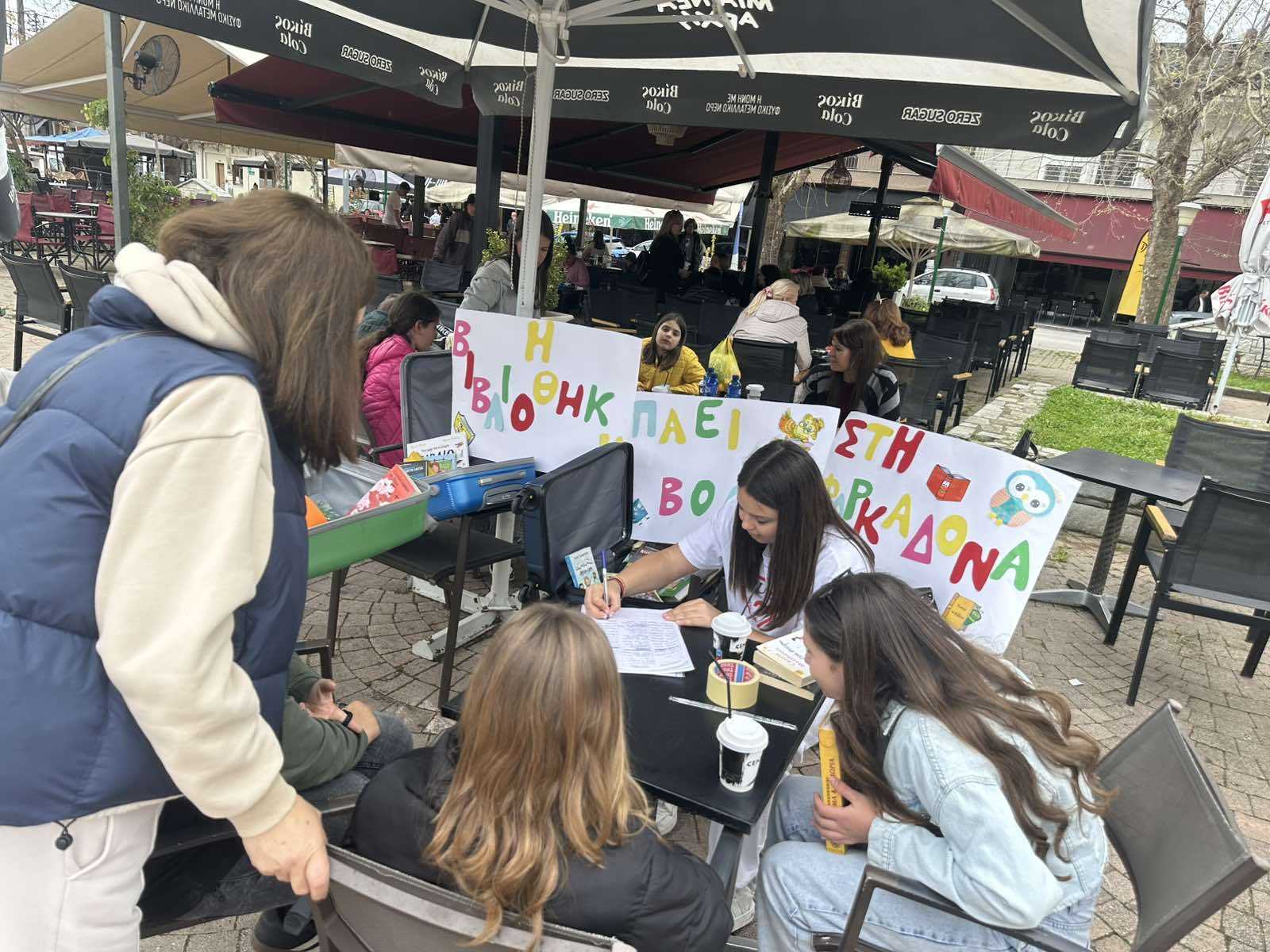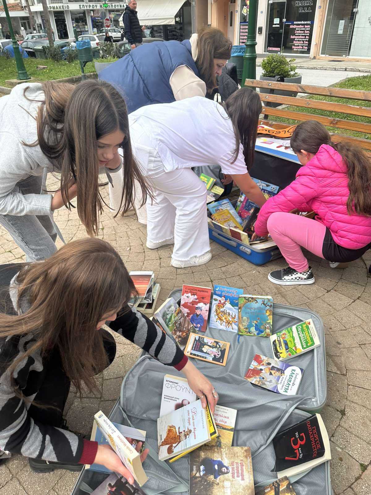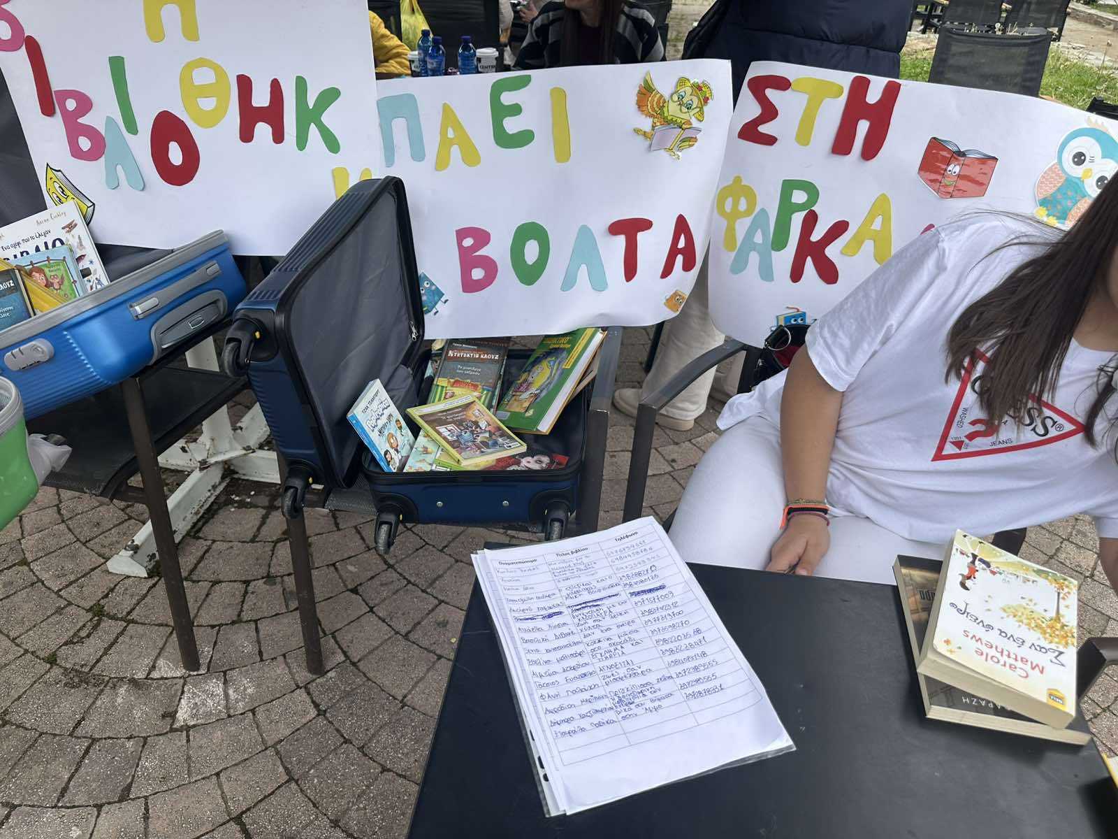 Έτσι κι εμείς… Είχαμε τη θέληση και βρήκαμε τον τρόπο. Πρωτοτυπήσαμε εθελοντικά! Γεμίσαμε τις βαλίτσες μας – και τι άλλο θα μπορούσαν να περιέχουν; Βιβλία φυσικά! Και να ’μαστε, στην πλατεία της Φαρκαδόνας, με μια βιβλιοβαλίτσα γεμάτη ελπίδα, λέξεις, εικόνες και φαντασία.