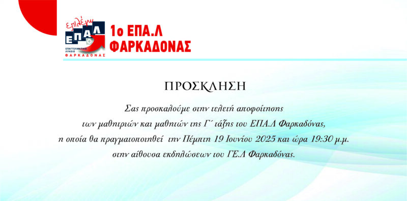 Μια ξεχωριστή και συγκινητική βραδιά ετοιμάζεται στο Επαγγελματικό Λύκειο Φαρκαδόνας, καθώς πλησιάζει η ώρα να αποχαιρετήσουμε τους μαθητές και τις μαθήτριες της Γ’ τάξης που ολοκληρώνουν ένα σημαντικό κεφάλαιο της ζωής και της εκπαιδευτικής τους πορείας.