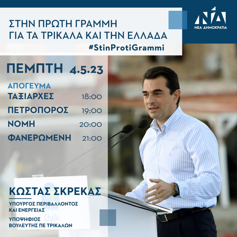 Ο Υπουργός Περιβάλλοντος και Ενέργειας και υποψήφιος βουλευτής Π.Ε. Τρικάλων, Κώστας Σκρέκας, την Πέμπτη 4 Μαΐου, το απόγευμα, θα επισκεφθεί τα ακόλουθα χωριά: