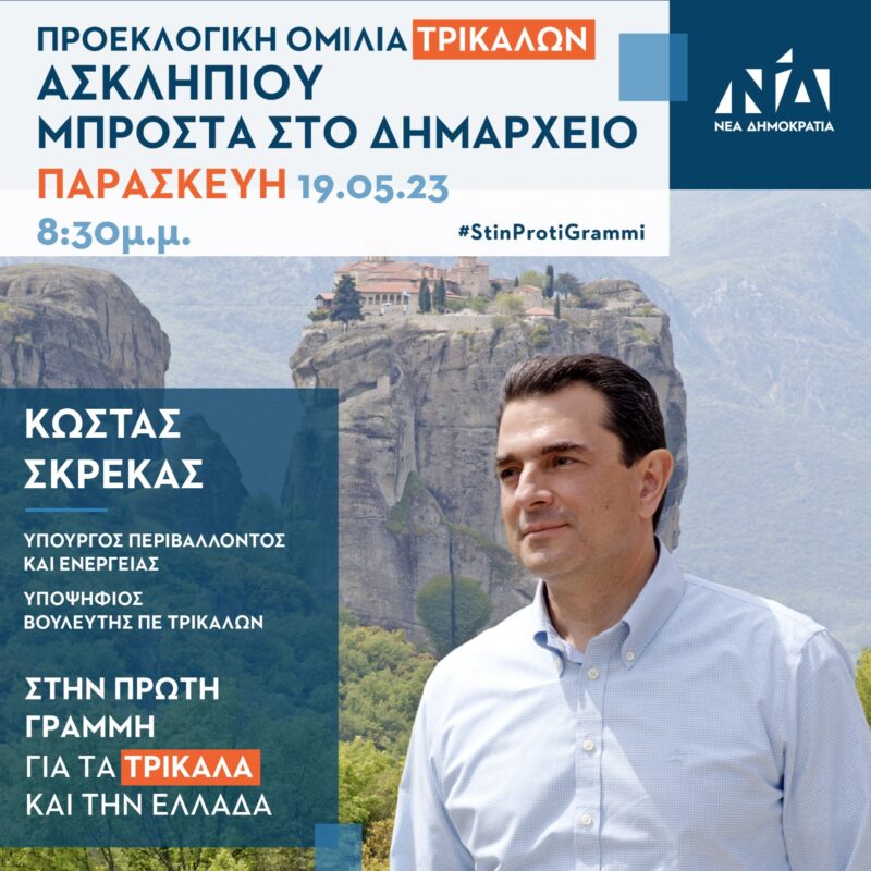 O Υπουργός Περιβάλλοντος και Ενέργειας και υποψήφιος βουλευτής Τρικάλων, Κώστας Σκρέκας, θα απευθύνει ομιλία στις Τρικαλινές και τους Τρικαλινούς, σήμερα, Παρασκευή 19 Μαΐου 2023, στις 08:30 μ.μ., στον πεζόδρομο της Ασκληπιού μπροστά στο Δημαρχείο.