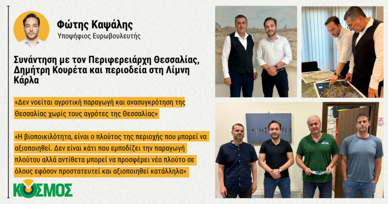 Την διάσταση της κυβέρνησης με την πραγματικότητα που φθάνει στο σημείο να παραβλέπει και τα επιστημονικά δεδομένα, διαπίστωσε ο υποψήφιος Ευρωβουλευτής με το ΚΟΣΜΟΣ, Φώτης Καψάλης και κατά την περιοδεία του στη Λίμνη Κάρλα όπου και συναντήθηκε με τον προϊστάμενο δασολόγο, Δημήτρη Μιχαλάκη, τον συντονιστή βιολόγο, Γιάννη Βέργο, και τον ειδικό συνεργάτη γεωπόνο, Χρήστο Χρηστάκη, του Φορέα Διαχείρισης Κάρλας – Μαυροβουνίου – Κεφαλόβρυσου Βελεστίνου – Δέλτα Πηνειού (Κα.Μα.Κε.Βε.Δε.Πη.).