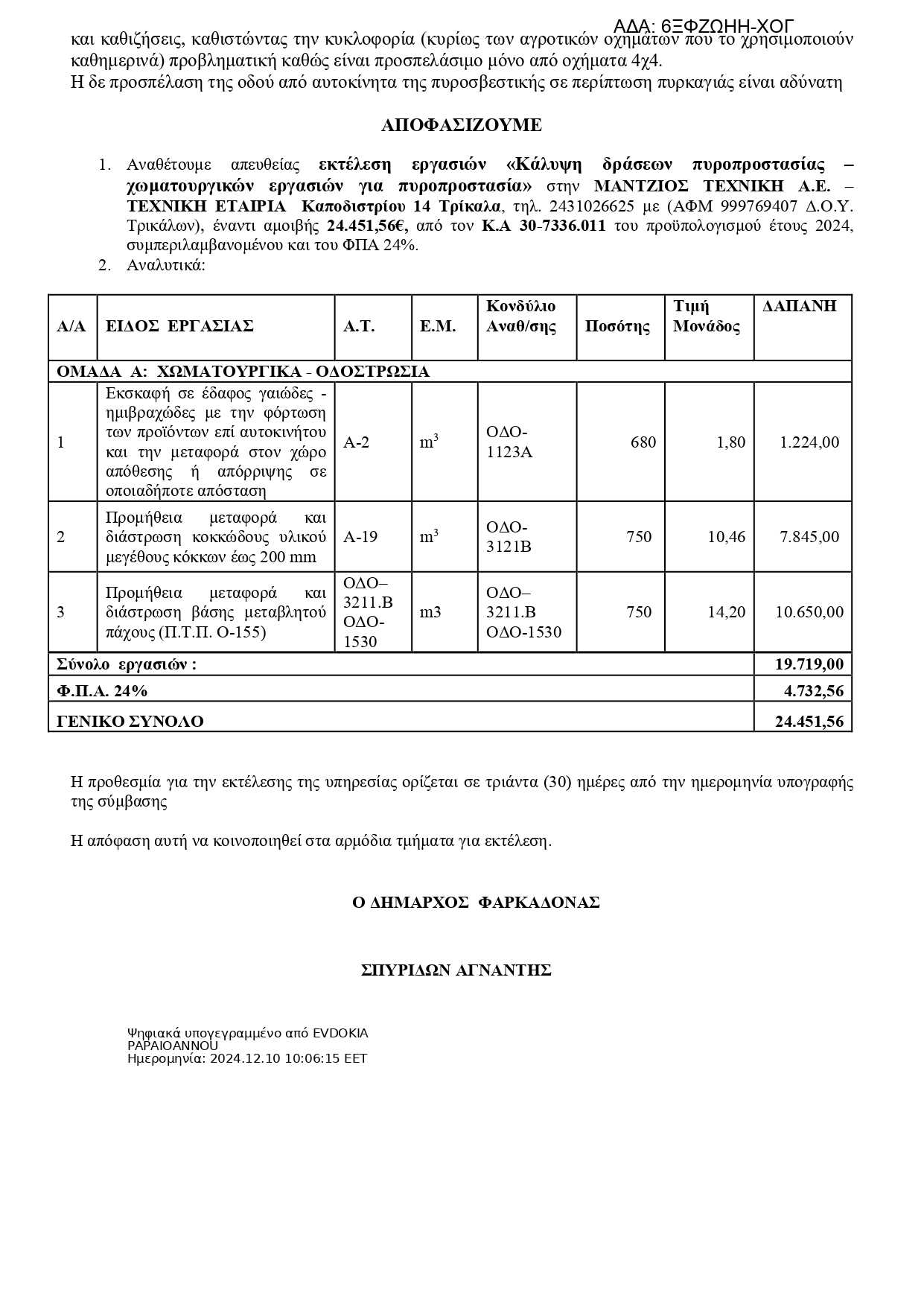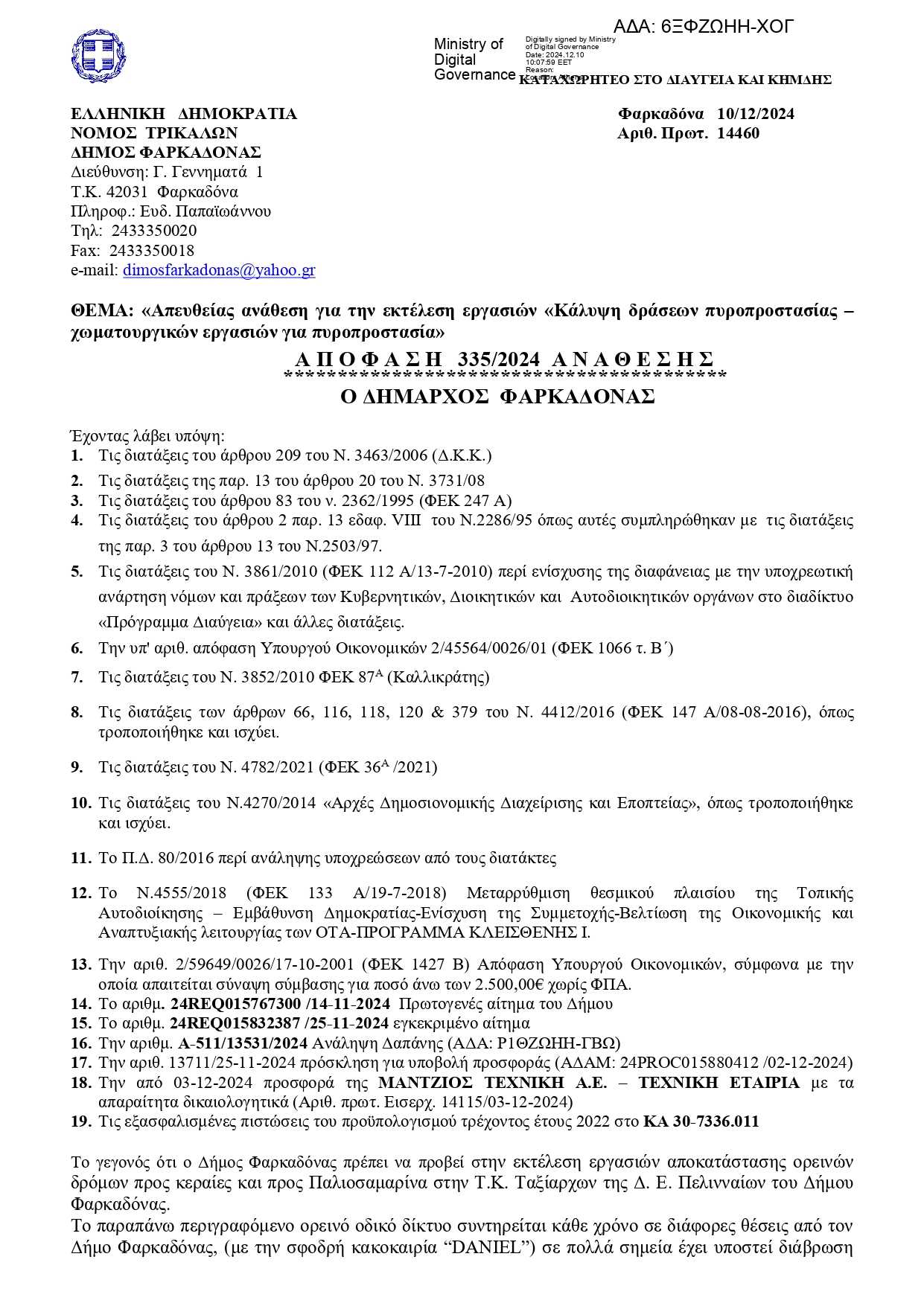 Ακούστε, λοιπόν: Ο δήμαρχος Φαρκαδόνας, με απόφασή του, προχωρά σε απευθείας ανάθεση 24.451,56 ευρώ (με 0% έκπτωση) για τον μήνα Δεκέμβριο του 2024, για εργασίες πυροπροστασίας. Καταλαβαίνετε τι σημαίνει αυτό; Ρωτώ: Ποιος λογικός άνθρωπος μπορεί να πιστέψει ότι ο μήνας Δεκέμβριος είναι επικίνδυνος για πυρκαγιές;