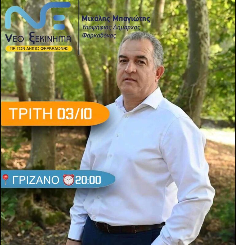 Δυναμικά και με αίσθημα ευθύνης απέναντι στην κοινωνία του Δήμου Φαρκαδόνας κινείται ο υποψήφιος δήμαρχος Φαρκαδόνας, Μιχάλης Μπαγιώτης, βαδίζοντας προς τις κάλπες της 8ης Οκτωβρίου.