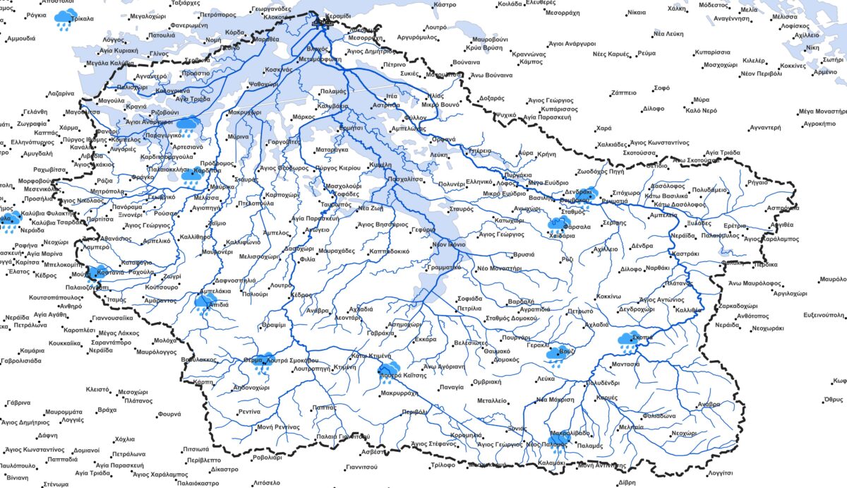 Εικόνα 1. Η απεικόνιση, της «λεκάνης απορροής» (επιφάνεια με «περίγραμμα με διακεκομμένη γραμμή με μαύρη απόχρωση») (του «”Ποταμού Ενιπέα” που αντιστοιχεί έως την θέση του «Παλιογέφυρου (Τοξοτού) του Κεραμιδίου» (θεματικό εικονίδιο «φράγμα με νερό από την μία του πλευρά» στο βορειοδυτικό όριο της προαναφερθείσας λεκάνης απορροής με «μαύρη» απόχρωση), στο ύψος του οικισμού “Κεραμίδι, (“Δήμου Φαρκαδόνας”), Π.Ε. (Νομού) Τρικάλων”», του «υδρογραφικού (γραμμικού) δικτύου» (γραμμές με «έντονη μπλε» απόχρωση με διαβάθμιση του πάχους της γραμμής, όπου το πάχος της κάθε γραμμής εξαρτάται από την “τάξη” του εκάστοτε ρέματος που αντιπροσωπεύει δηλαδή όσο μεγαλύτερη είναι η “τάξη” του ρέματος τόσο παχύτερη είναι και η αντίστοιχη γραμμή που το αντιπροσωπεύει), των «οικισμών του “Δήμου Παλαμά”», των «οικισμών του “Δήμου Καρδίτσας”», των «οικισμών του “Δήμου Φαρσάλων”», των «οικισμών του “Δήμου Φαρκαδόνας”», των «οικισμών του “Δήμου Σοφάδων”», των «οικισμών του “Δήμου Αλμυρού”», των «οικισμών του “Δήμου Κιλελέρ”», των «οικισμών του “Δήμου Μουζακίου”», των «οικισμών του “Δήμου Λίμνης Πλαστήρα”», των «οικισμών του “Δήμου Μακρακώμης”», των «οικισμών του “Δήμου Λαμιέων”», και των «οικισμών του “Δήμου Δομοκού”», (κουκίδες με «μαύρη» απόχρωση και ονομασία, επίσης, με «μαύρη» απόχρωση), του «περιγράμματος του “Δήμου Παλαμά”», του «περιγράμματος του “Δήμου Καρδίτσας”», του «περιγράμματος του “Δήμου Φαρσάλων”», του «περιγράμματος του “Δήμου Φαρκαδόνας”», του «περιγράμματος του “Δήμου Σοφάδων”», του «περιγράμματος του “Δήμου Αλμυρού”», του «περιγράμματος του “Δήμου Κιλελέρ”», του «περιγράμματος του “Δήμου Μουζακίου”», του «περιγράμματος του “Δήμου Λίμνης Πλαστήρα”», του «περιγράμματος του “Δήμου Μακρακώμης”», του «περιγράμματος του “Δήμου Μακρακώμης”», και του «περιγράμματος του “Δήμου Δομοκού”» (διακεκομμένες γραμμές με «μαύρη απόχρωση»), οι περιοχές που πλημμύρισαν κατά την διάρκεια της εκδήλωσης του ακραίου μετεωρολογικού φαινομένου με την αντιστοιχισμένη κωδική ονομασία «Daniel» (me «γαλάζια απόχρωση») και οι διάφοροι μετεωρολογικοί σταθμοί στην ευρύτερη περιοχή της προαναφερθείσας λεκάνης απορροής (θεματικά εικονίδια «σύννεφα με βροχή» με «θαλασσί απόχρωση»), όπως απεικονίζονται στο «ελεύθερο διαδικτυακά λογισμικό» «Q.G.I.S.» [4], μέσω των σχετικών αρχείων που ανακτήθηκαν τόσο από την σχετική διαδικτυακή «πλατφόρμα» («Copernicus») όσο και από την σχετική διαδικτυακή «πλατφόρμα» («ΕΛ.ΣΤΑΤ.»),[1,2,4].