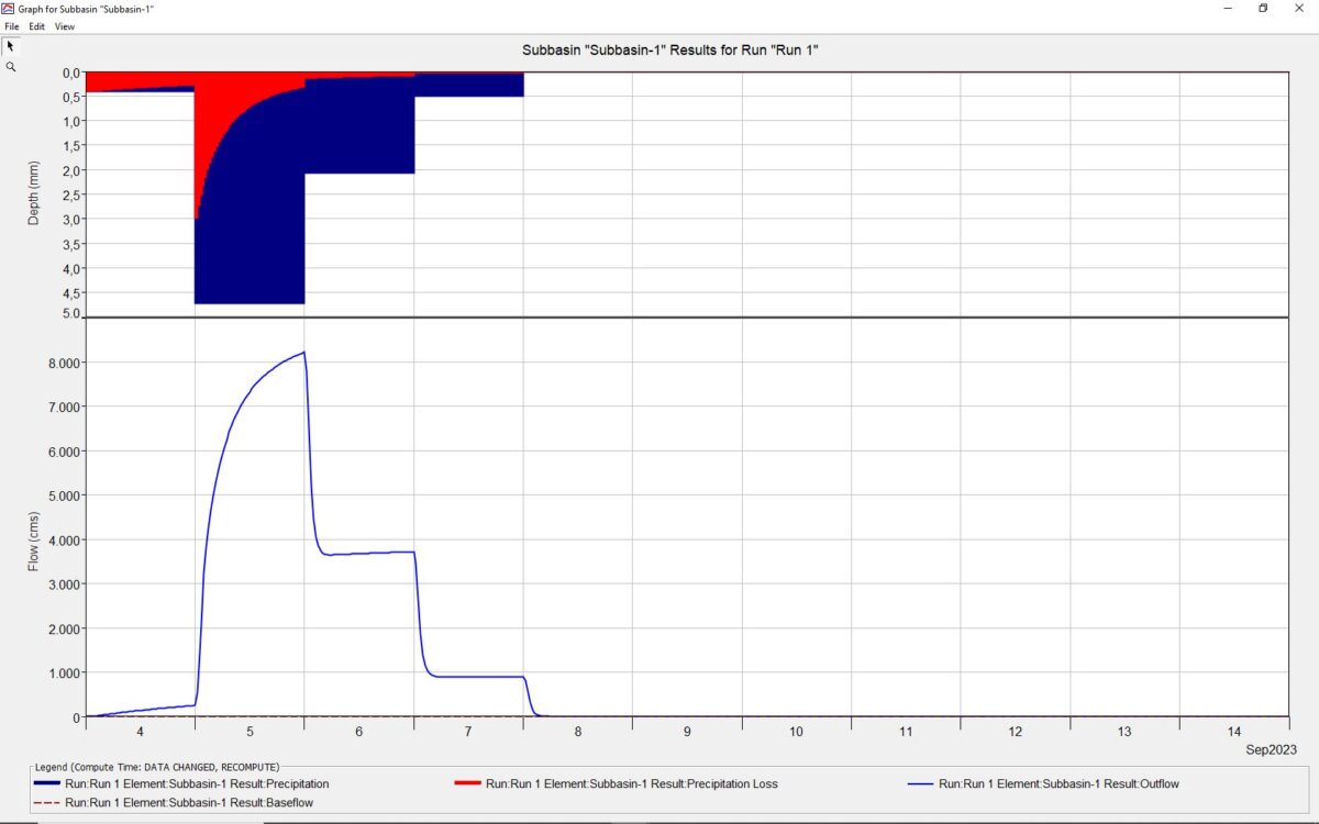 Επιπλέον, αρχικά, στην παρακάτω εικόνα απεικονίζεται το, “προσομοιωμένο ρεαλιστικό”, «διάγραμμα / ιστόγραμμα βροχόπτωσης / απορροής» του χρονικού διαστήματος, “04-07/09/2023” (“369,20 mm”), (το οποίο και θα «αποδώσει» την, “προσομοιωμένη ρεαλιστική”, παροχή αιχμής νερού και συγκεκριμένα «8.220,50 κυβικά μέτρα ανά δευτερόλεπτο» ή αλλιώς «8.220,50 m3/sec»), [το οποίο και «απέδωσε», λόγω ενός ακραίου μετεωρολογικού φαινομένου, με την κωδική ονομασία «Daniel», την, “προσομοιωμένη ρεαλιστική”, συνολική ποσότητα νερού, συγκεκριμένα, «1.013.344.000 κυβικά μέτρα (τόνους νερού)» ή αλλιώς «1.013.344.000 m3 (τόνους νερού)»], και το αντίστοιχο, “προσομοιωμένο ρεαλιστικό”, «υδρογράφημα απορροής πλημμύρας» που προκύπτει από το συγκεκριμένο, “προσομοιωμένο ρεαλιστικό”, επεισόδιο βροχόπτωσης, (λόγω του ακραίου μετεωρολογικού φαινομένου, με την αντιστοιχισμένη κωδική ονομασία «Daniel»), (η ανάλυση και οι υπολογισμοί έγιναν με το ελεύθερο στο διαδίκτυο λογισμικό «HECHMS» του «U.S.A. Army Corps of Engineers» δηλαδή του «Σώματος Μηχανικών του Στρατού των Η.Π.Α.») [1,2,4,5,6.1-6.3].