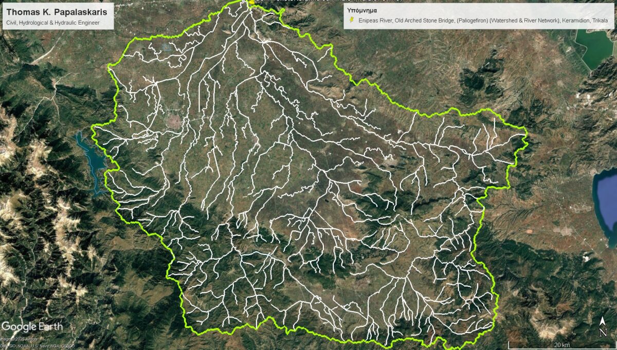 Εικόνα 3. Η απεικόνιση της λεκάνης απορροής [περίγραμμα με «ανοιχτή πράσινη» απόχρωση, που αντιστοιχεί έως την θέση του «Παλιογέφυρου (Τοξοτού) του Κεραμιδίου», στο ύψος του οικισμού “Κεραμίδι, (“Δήμου Φαρκαδόνας”), Π.Ε. (Νομού) Τρικάλων”»] και του αντίστοιχου, περιεχόμενου σε αυτήν, υδρογραφικού δικτύου (γραμμές με «λευκή» απόχρωση) του «Ποταμού Ενιπέα» επί του υπόβαθρου της διαδικτυακής πλατφόρμας «Google Earth» [1,2,4,7].