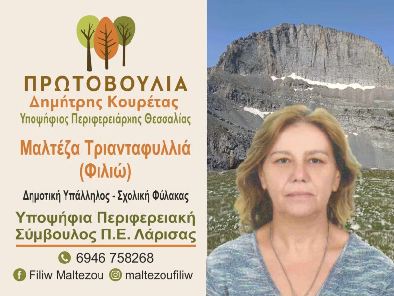Με το συνδυασμό «Πρωτοβουλία» του Δημήτρη Κουρέτα κατέρχεται στις περιφερειακές εκλογές η Τριανταφυλλιά Μαλτέζα, με καταγωγή από το Γριζάνο. Η Φιλιώ Μαλτέζα, κατέρχεται υποψήφια περιφερειακή σύμβουλος στην Περιφερειακή Ενότητα Λάρισας, προσκαλώντας τους πολίτες όλου του νομού Λάρισας να στηρίξουν την προσπάθεια της, όπως φυσικά και του συνδυασμού που κατέρχεται με αξιώσεις στην Περιφέρεια Θεσσαλίας.