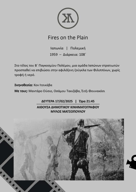 Μια από τις καλύτερες αντιπολεμικές ταινίες όλων των εποχών προβάλλει τη Δευτέρα 17 Φεβρουαρίου 2025 η Κινηματογραφική Λέσχη Τρικάλων. Πρόκειται για το γιαπωνέζικο “Fires on the Plain” (“Φωτιές στον Κάμπο”), μια ταινία που παρουσιάζει τη φρίκη του πολέμου, μέσα από τις αγωνιώδεις περιπέτειες μιας ομάδας Ιαπώνων στρατιωτών.