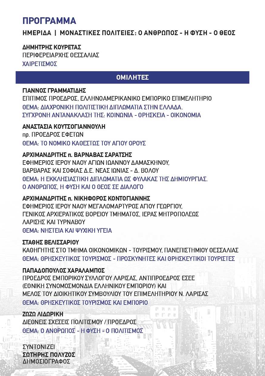 Στόχος της εκδήλωσης είναι να αναδειχθεί ο πολυδιάστατος ρόλος των μοναστικών πολιτειών, όπως το Άγιον Όρος και τα Μετέωρα, μέσα από ένα ευρύ φάσμα θεματικών προσεγγίσεων: πνευματικών, νομικών, διπλωματικών, επιχειρηματικών και διατροφικών.
